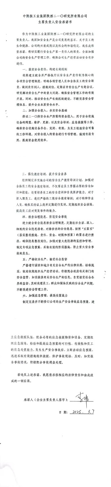 中陜核工業集團陜西二一〇研究有限公司主要負責人安全承諾書